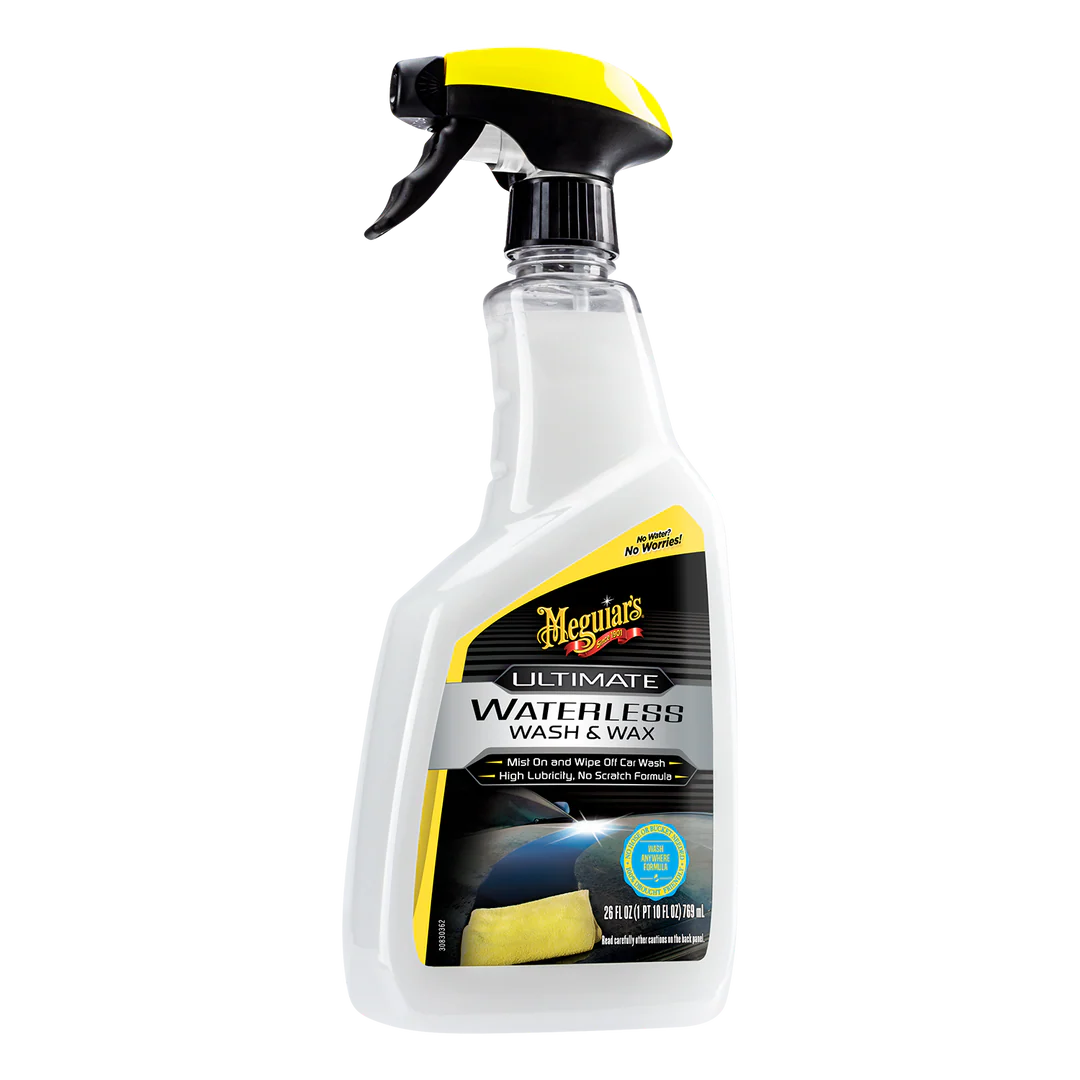 ¡Solo rocía y limpia para un brillo de recién lavado y encerado en tan solo 15 minutos! Meguiar’s Ultimate Waterless Wash and Wax es un aerosol que elimina la suciedad y la mugre mientras deja una capa protectora de cera hidrofóbica en cualquier superficie de un automóvil. Es fácil de usar y puede transformar una apariencia monótona y sucia en un automóvil deslumbrante en solo 15 minutos, sin necesidad de agua. Una botella y unas toallas de microfibra pueden lavar y encerar hasta cinco coches de tamaño medio. También es seguro para usar en todo tipo de ruedas, caucho, plástico, vinilo y vidrio.